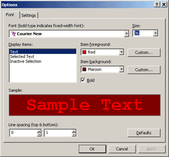 This time around an Options dialog has been implemented which allows you to select the font and colours used by Neatpad. The dialog is fairly complete and the settings are saved to the registry each time Neatpad exits. The second options-pane doesn’t do anything yet, but I have left it in as a “todo” which will be implemented at some point in the future. The code can be found in the Neatpad directory, in the Options.c and OptionsFont.c files.